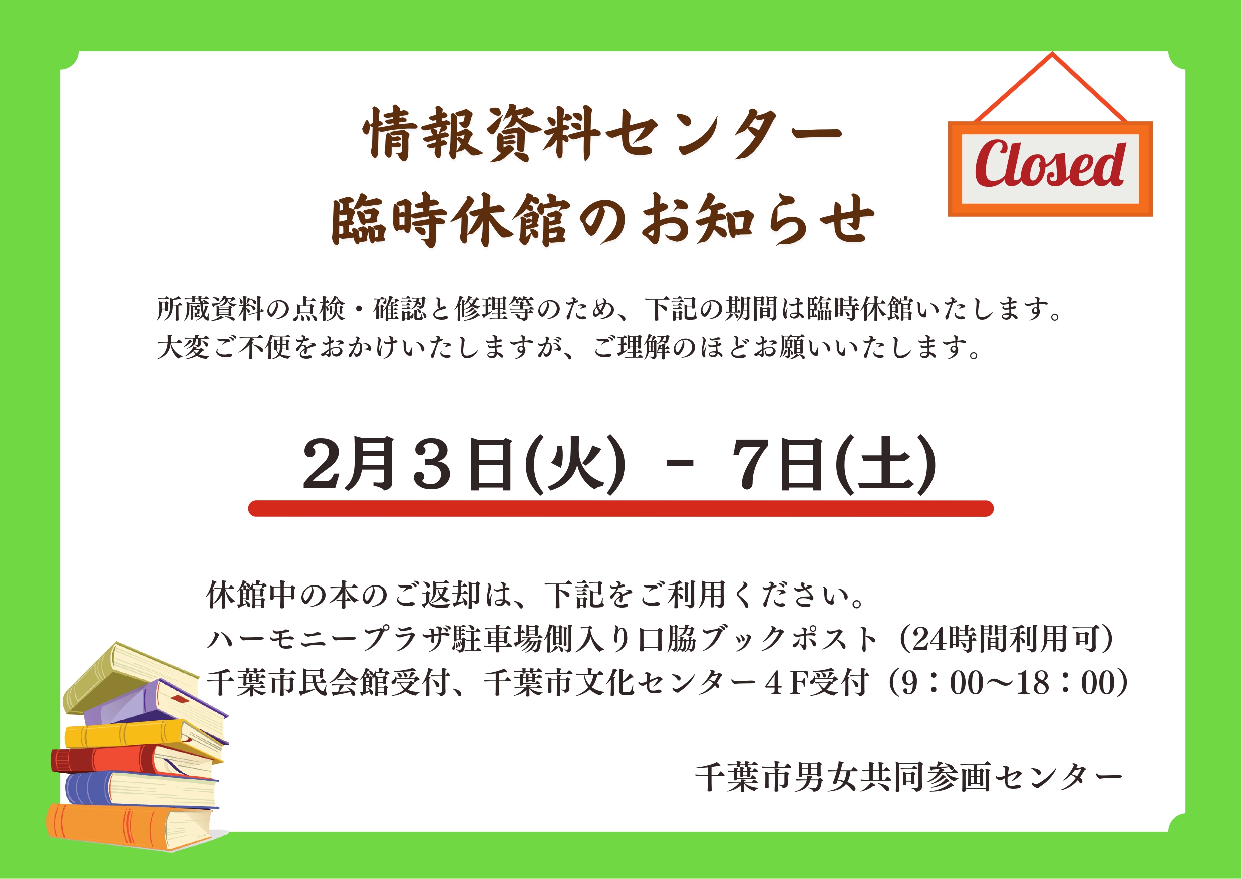 | 返却場所 | ①情報資料センター 受付カウンター ②ブックポスト(ハーモニープラザ駐車場側入口 / 24時間可) ③千葉市民会館 受付カウンター ④千葉市文化センター 4階受付 ※①③④は、開館時間内 |