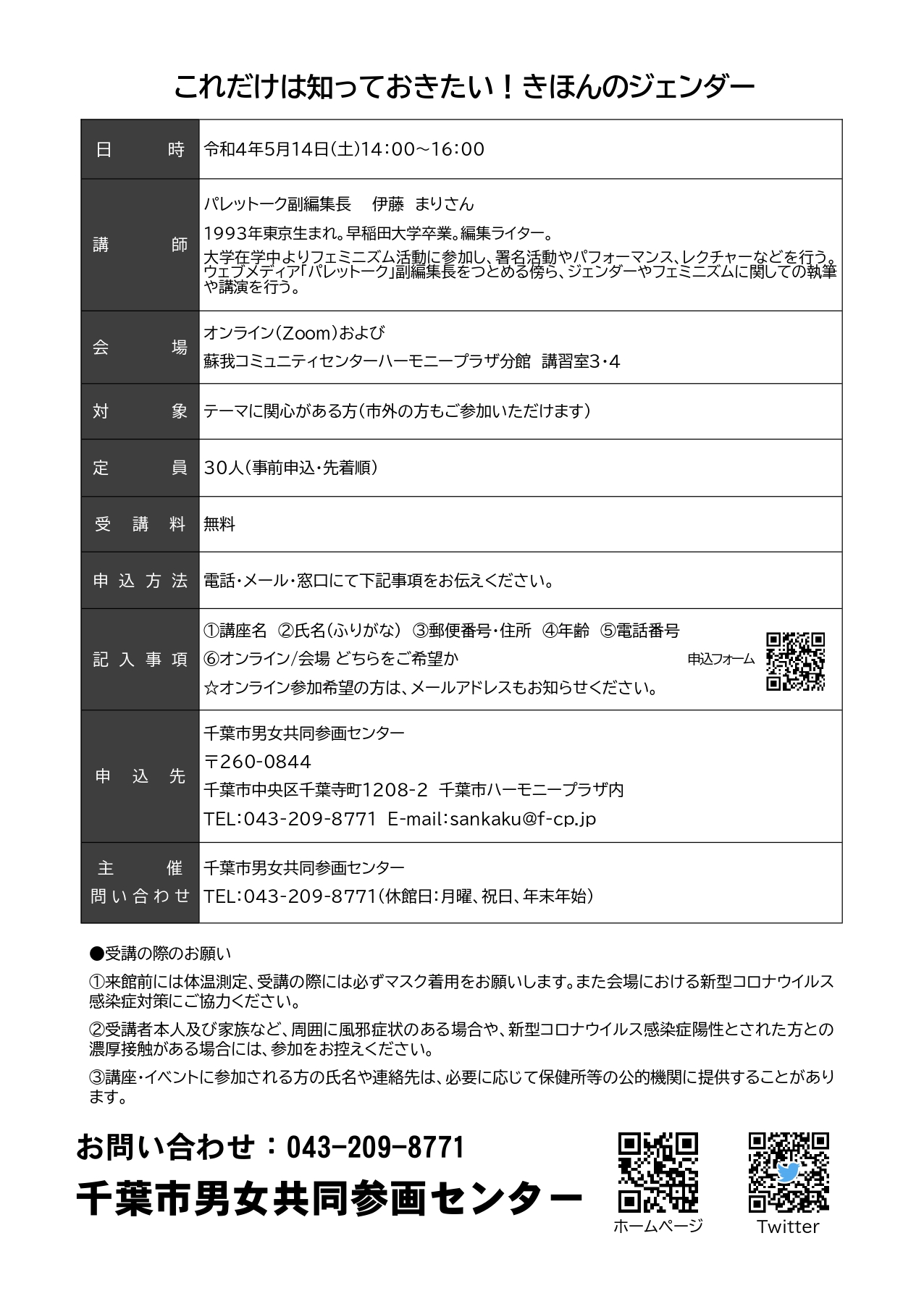 | 申込先 | 千葉市男女共同参画センター 〒260-0844 千葉市中央区千葉寺町1208-2 千葉市ハーモニープラザ内 TEL:043-209-8771 e-mail:sankaku@f-cp.jp |