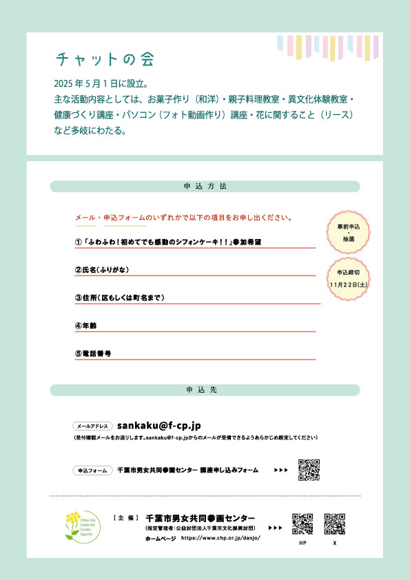 | 申込先 | 千葉市男女共同参画センター 千葉市中央区千葉寺町1208-2 千葉市ハーモニープラザA棟 TEL:043-209-8771 e-mail:sankaku@f-cp.jp |