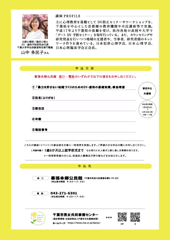 DV・暴力に関する理解促進講座 「暴力を許さない地域づくりのためのDV・虐待の基礎知識」 (幕張本郷公民館共催)