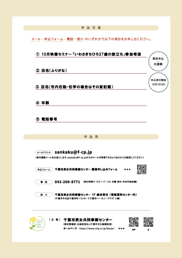 申込先 | 千葉市男女共同参画センター 千葉市中央区千葉寺町1208-2 千葉市ハーモニープラザA棟 TEL:043-209-8771 e-mail:sankaku@f-cp.jp |