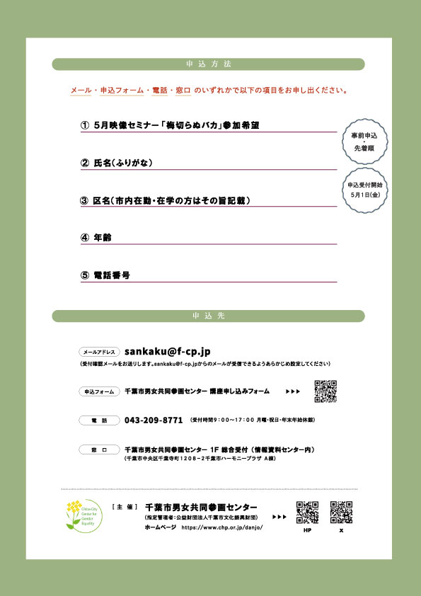 | 申込先 | 千葉市男女共同参画センター 千葉市中央区千葉寺町1208-2 千葉市ハーモニープラザA棟 TEL:043-209-8771 e-mail:sankaku@f-cp.jp |