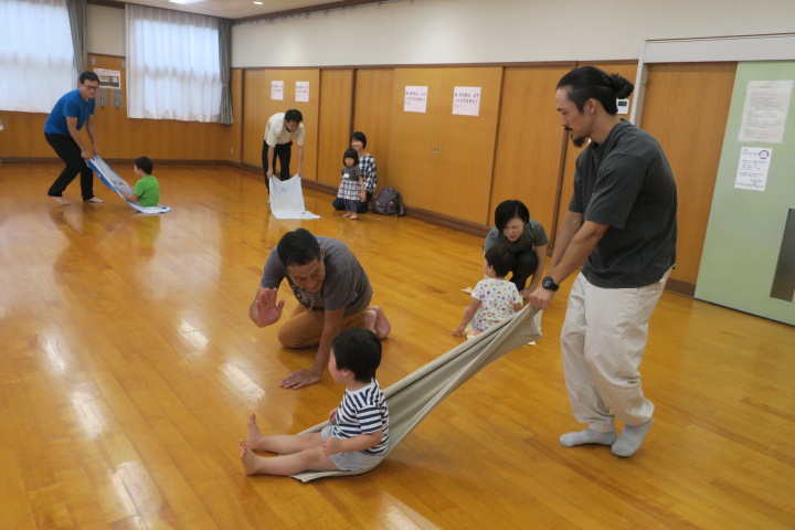 親子で一緒に体を動かし、身近な生活用品を使った遊びをみんなで楽しみました。
