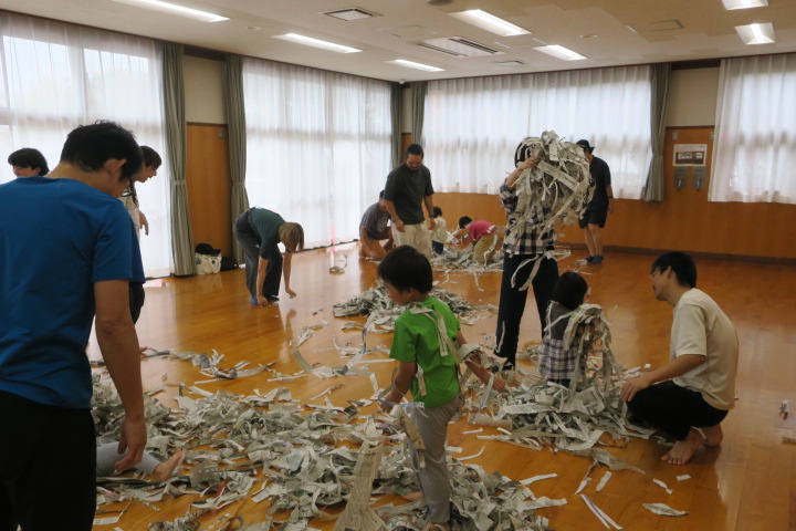 親子で一緒に体を動かし、身近な生活用品を使った遊びをみんなで楽しみました。