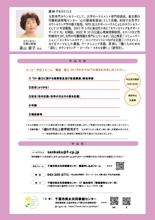 申込先 | 千葉市男女共同参画センター 千葉市中央区千葉寺町1208-2 千葉市ハーモニープラザA棟 TEL:043-209-8771 e-mail:sankaku@f-cp.jp |