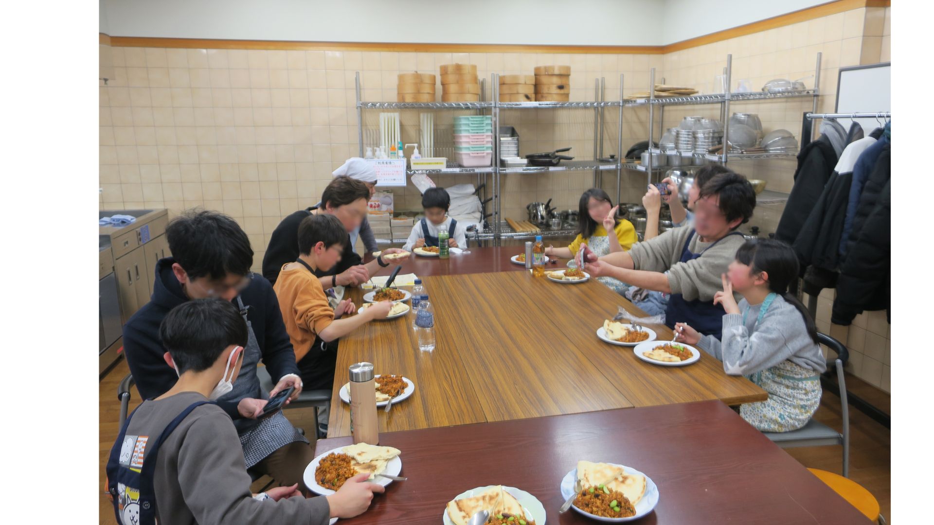 | 実施報告 | 「パパ世代にも子世代にも必須!手軽に高たんぱく料理」を実施しました。 親子で協力してナンとキーマカレーを作りました。調理器具と食器も受講者たち自身で棚から用意し、食器洗いと片付けまで行いました。楽しみながら短い時間で、たんぱく質リッチな料理ができました。 【 参加者の声 】 ・料理をしたことがなかったので、いい体験ができた。 ・かたづけがめんどくさい。 ・今日の自分で作ったナンはとてもおいしかった。 |