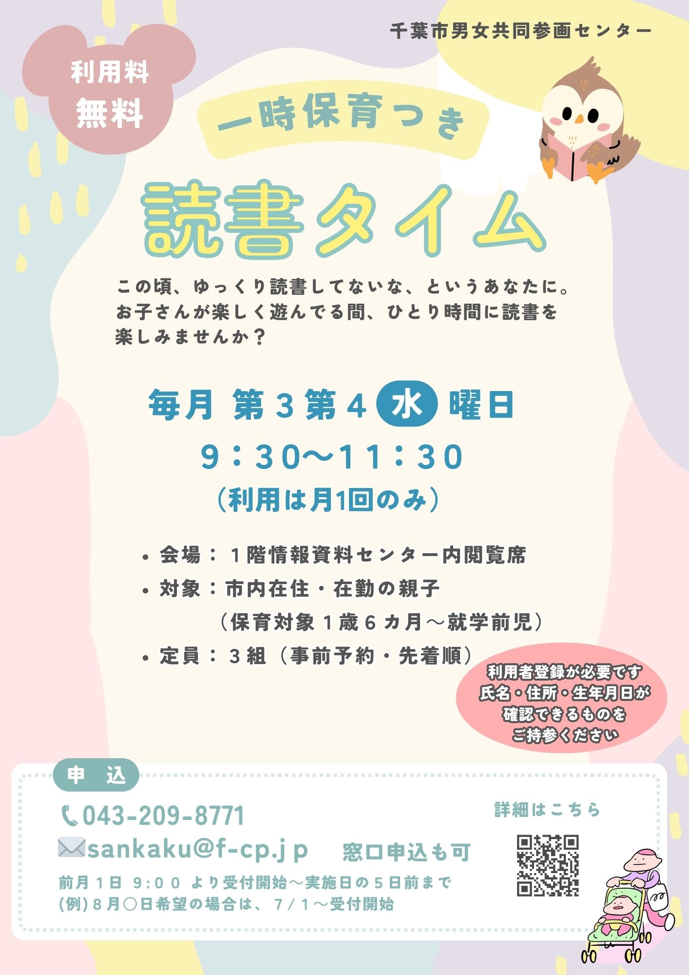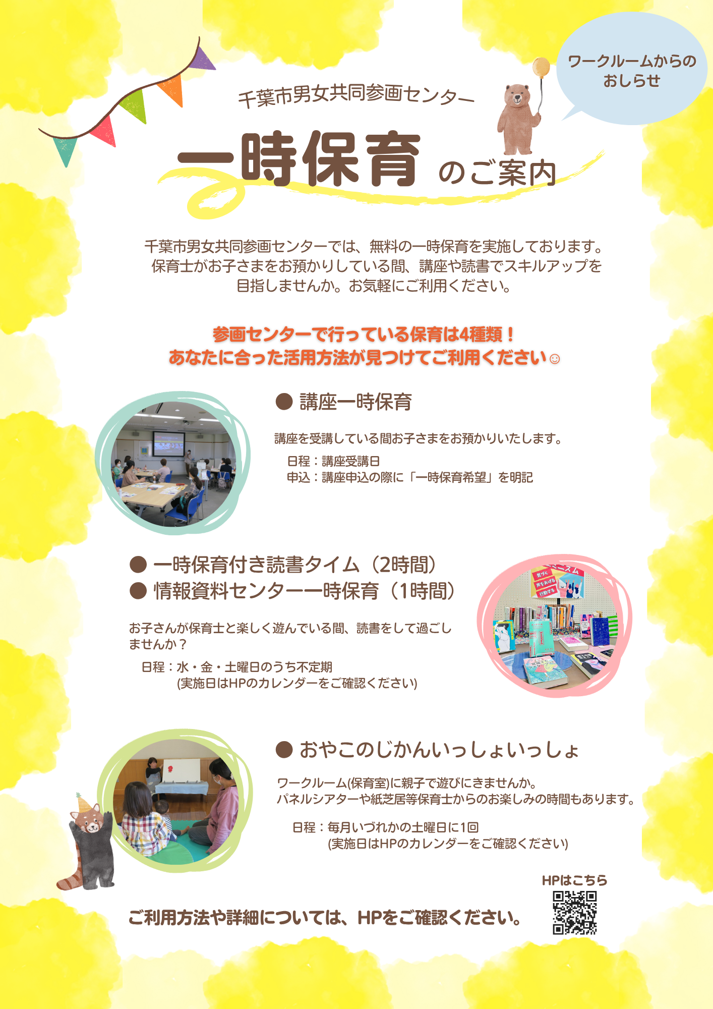 お子さまが保育士と楽しく遊んでいる間、読書をして自分時間を過ごしませんか? 1時間なので、お子さまの初めての一時保育にもいかがでしょうか。 ※おひとり様1週間に1回のご利用を限度とさせていただきます 日 程:水・金・土曜日(実施日程はカレンダーよりご確認ください) A 9:30-10:30 B 11:00-12:00 C 13:30-14:30 D 15:00-16:00 会 場:千葉市男女共同参画センター 情報資料センター 対 象:千葉市在住・在勤・在学の親子(保育対象:1歳6ヵ月~就学前児) 利用料:無料 申 込:メール・電話(043-209-8771)・窓口よりお申し込みください。 受付開始:前月1日9:00から申込開始 ※情報資料センターの利用者登録が必要です。氏名・住所・生年月日が確認できるものをご持参ください |